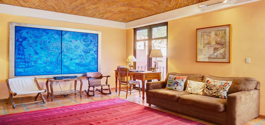 El acceso a La Aldea está en la Calle Ancha de San Antonio, una de las avenidas más vibrantes de #SanMigueldeAllende, famosa por sus múltiples galerías de arte, restaurantes y tiendas, pero al abrir las puertas para acceder a la pequeña calle privada, un muro de piedra cubierto de enredaderas y flores de trompeta sirve como transición del vibrante centro de la ciudad a esta relajante y auténtica #casa mexicana.